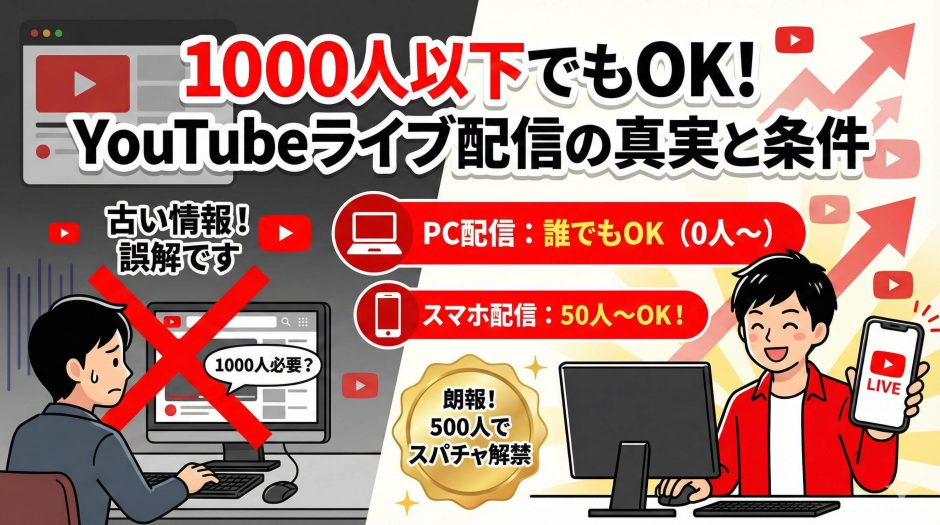 登録者数が1,000人以下でも、YouTubeライブ配信は可能です。そして、むしろ登録者が少ない時期こそ、ライブ配信はチャンネルを急成長させるための「最強の武器」になります。