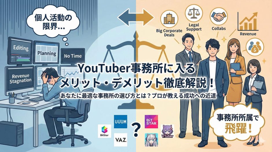 YouTuber事務所(MCN)に所属することは、さらなる飛躍への近道ですが、選び方を間違えると「報酬を取られるだけで何もしてくれない」という事態にもなりかねません。