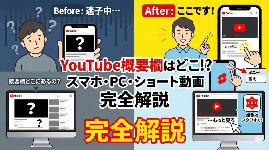 この記事では、スマホアプリ(iPhone/Android)、PCブラウザ、そして分かりにくい「ショート動画」の概要欄の場所を画像なしでも分かるように丁寧に解説します。投稿者向けの編集場所も合わせて紹介します。